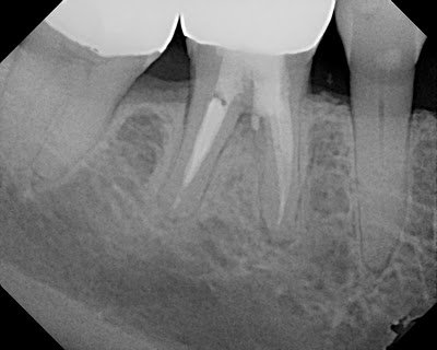Post-Op films shows the MTA repair in the furcal area. Note the large lesion around the mesial root.