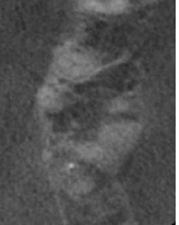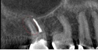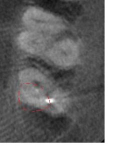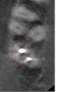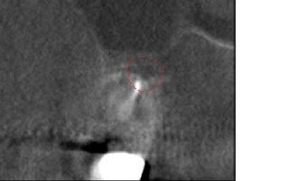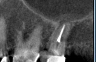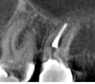 This last image to the left is a horizontal slice in the apical third of the root again displaying the palatal radiolucency forming.