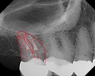 Drawn below is what I drew for the patient, predicting the true root and canal anatomy of the tooth and showing where I speculated there to be an untreated distal buccal canal.