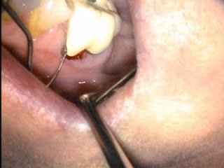 The important point here is since I had done the initial root canal treatment, I knew that the tooth was vital preoperatively. There is no way I would consider touching this tooth with any endodontic therapy since I know that I cannot improve upon my root canal treatment. The dental history leads me to look for sources of trauma to the ligament, occlusion and biologic width infringement in this case.