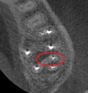 Circled is the MB root in cross section. From this view, it becomes apparent there is untreated canal anatomy in the form of a MB2 canal.