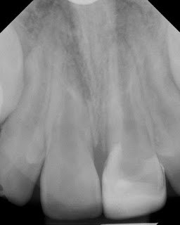 This young patient had a traumatic incident to tooth #9 5 months earlier. At our initial evaluation, the tooth responded normal to thermal testing. We decided to monitor the tooth over time. At a follow up visit, #9 exhibited no response to thermal testing with an open apex.