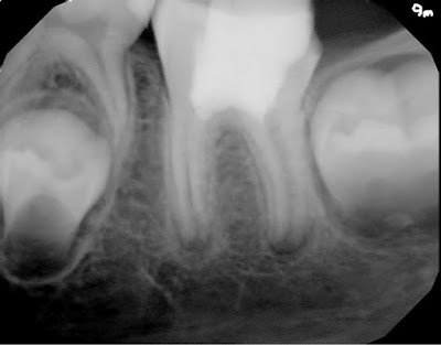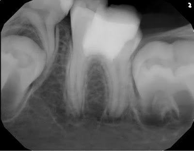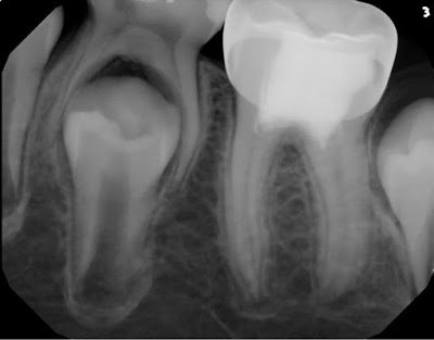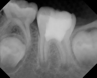 This 8 yr old presented in 2012 with deep caries on an immature #19. The pulp tested vital, but his dentist expected pulpal exposure. He was also reporting night time pain, which typically is associated with irreversible pulpitis.